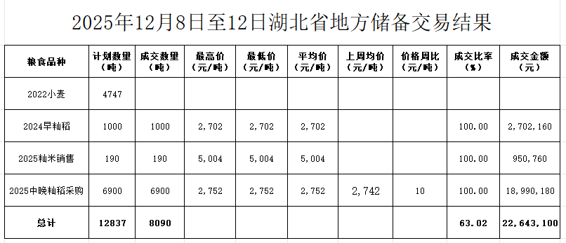 本周(2025年12月8日—12月12日)湖北无国家政策性粮食投放。